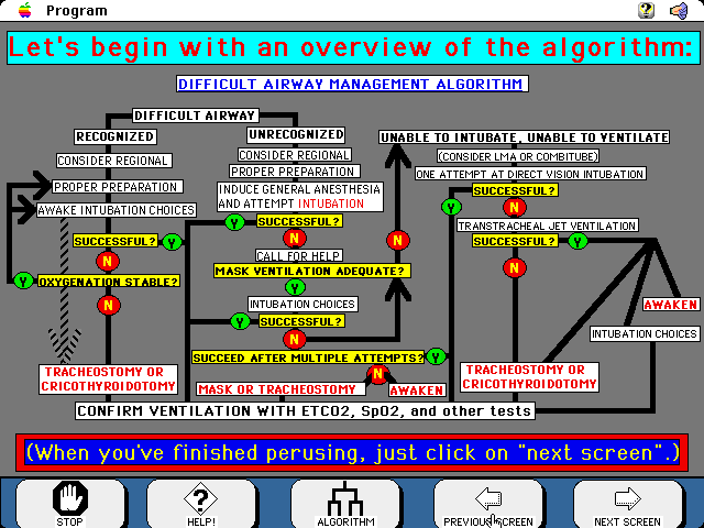 One example page from the tutorial (Patient History and Difficult Airway)...the program takes you step-by-step through the algorithm.