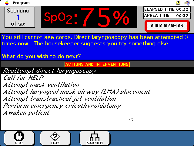 Simulator algorithm screenshot, showing continued desaturation of your patient.An airway consult is always available...but the clock keeps ticking!