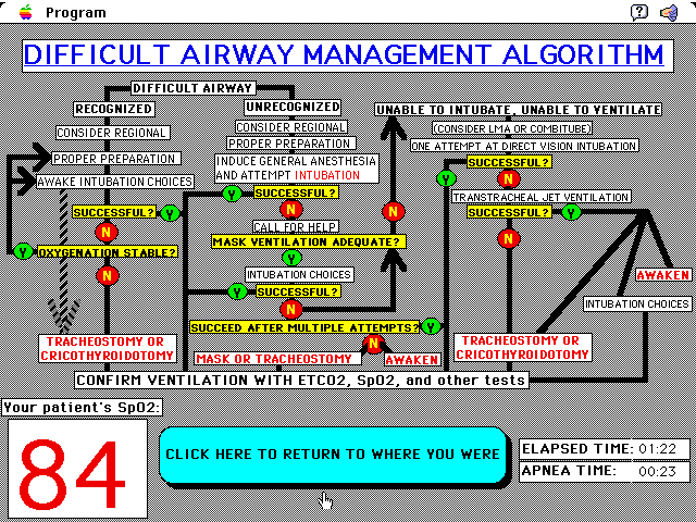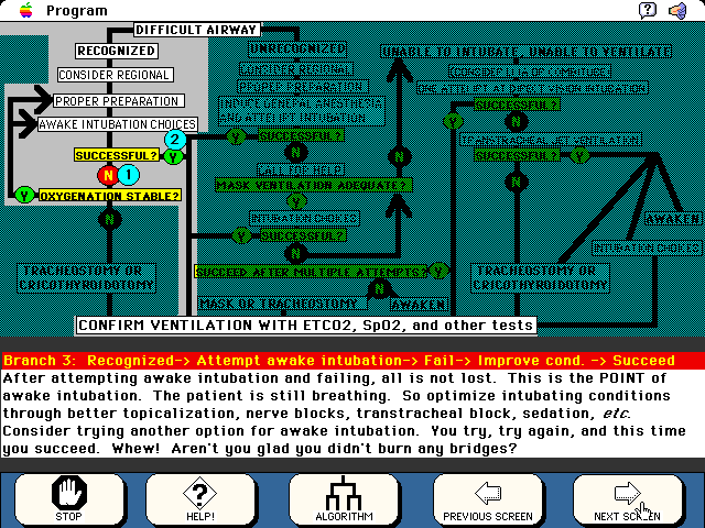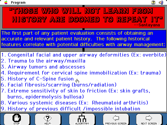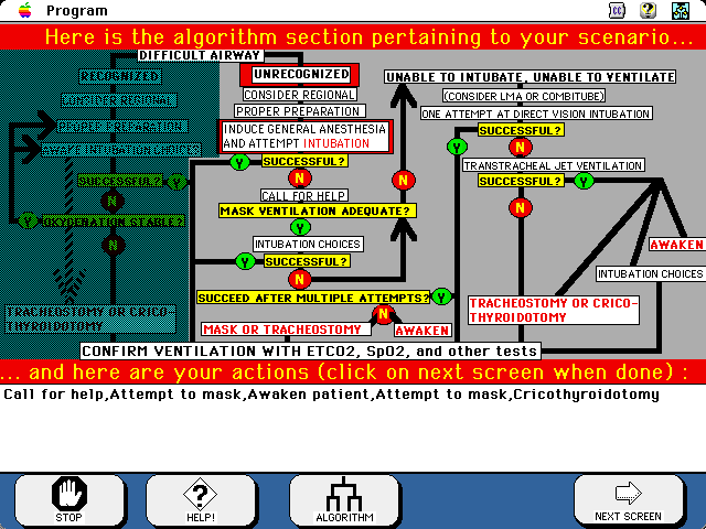 One example page from the tutorial (Patient History and Difficult Airway)...the program takes you step-by-step through the algorithm.