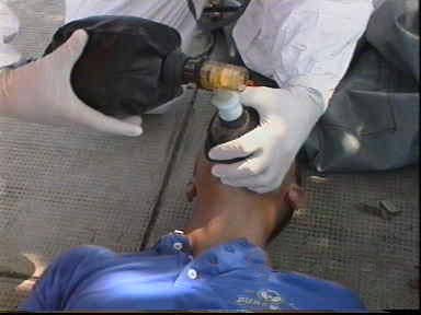 Il rianimatore dell'equipe sanitaria pratica la ventilazione in maschera con pallone di Ambu ad un intossicato ritrovato in apnea sul luogo del disastro