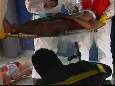 Le vittime del disastro chimico una volta recuperate dal luogo del disastro sono sottoposte alla decontaminazione dal tossico con getti d'acqua all'interno della tenda
