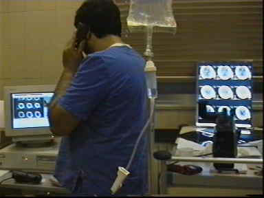 Le immagini radiografiche della TAC cranio di un paziente traumatizzato/intossicato, riprese da una telecamera collegata ad un computer, vengono inviate utilizzando una linea telefonica digitale (ISDN) al centro tossicologico di riferimento (CNIT- Pavia)